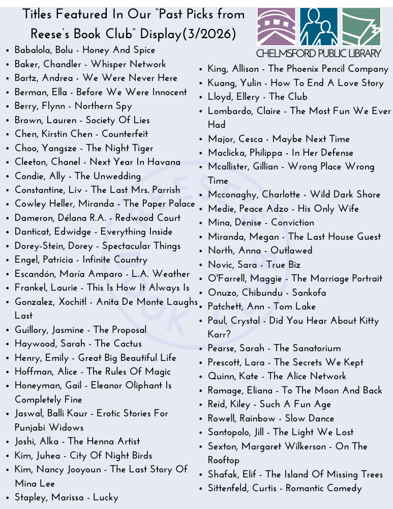 You'll find these and other titles in our "Past Picks from Reese's Book Club" display. For additional title suggestions, see the lists below: